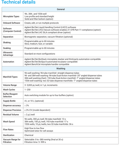 • Compatible with 96-, 384-, and 1536-well plate configurations, the Dual-Action manifold has rapid wash speeds for increased efficiency in your workflow. Wash speeds for the three plate types range from 13 to 36 seconds, saving time in the wash process